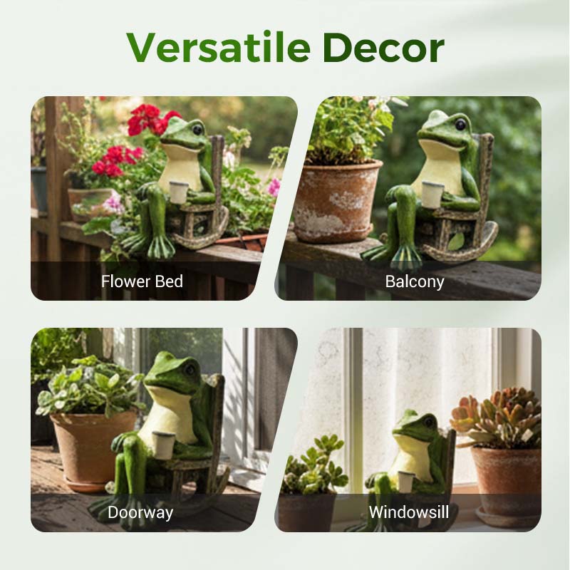 A HINTÁZÓ SZÉK BÜFFÉ BÁJOS TERVEZÉSE – A hintaszéken pihenő béka szeszélyes kialakítása minden térnek játékos bájt és rusztikus vonzerőt kölcsönöz, így kellemes és hangulatos középpontot teremt.